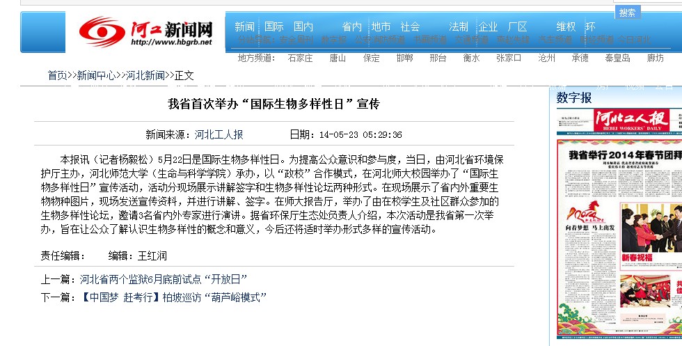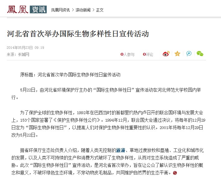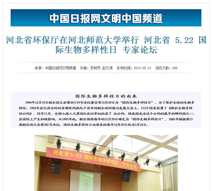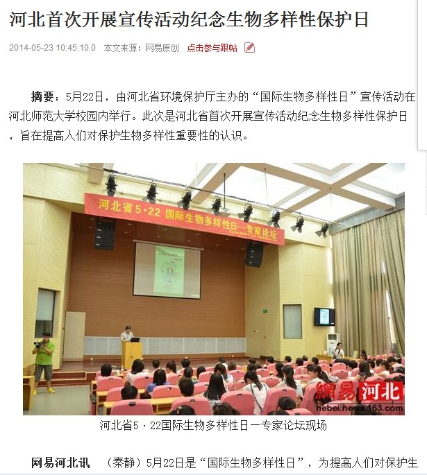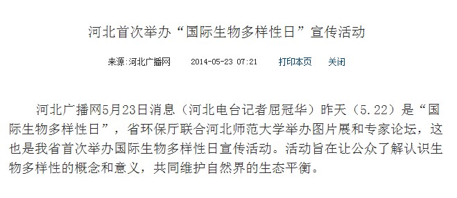 5月22日是国际生物多样性日,省环境保护宣传教育中心组织新闻媒体对我省首次举办的国际生物多样性日宣传活动进行了全面深入地报道。此次活动旨在让公众了解认识生物多样性的概念和意义,共同维护自然界的生态平衡。参与报道的包括河北电台、长城网、河北工人报、燕赵都市报、网易河北、中国日报网及省环保厅新浪官方微博等报纸、广播、网络媒体。
