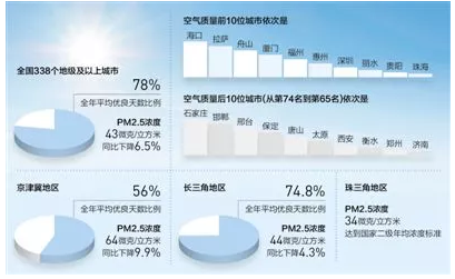从重点区域的情况看,京津冀地区全年平均优良天数比例为56.0%,PM2.5浓度为64微克/立方米,同比下降9.9%,PM10浓度为113微克/立方米,同比下降4.2%。长三角地区全年平均优良天数比例为74.8%,PM2.5浓度为44微克/立方米,同比下降4.3%,PM10浓度为71微克/立方米,同比下降5.3%。