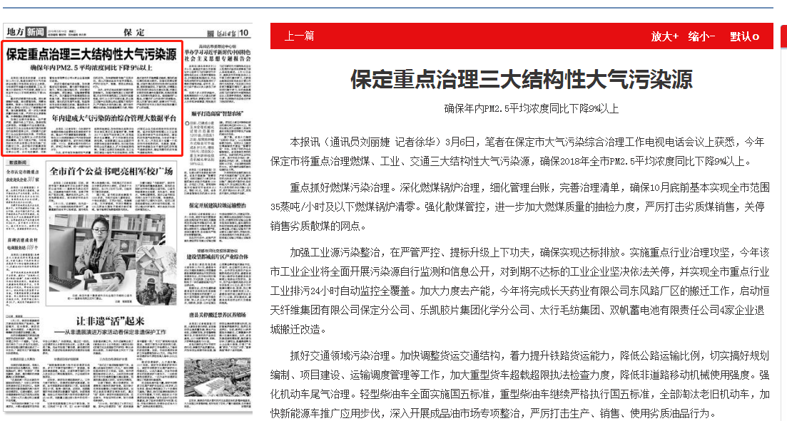本报讯(通讯员刘丽婕 记者徐华)3月6日,笔者在保定市大气污染综合治理工作电视电话会议上获悉,今年保定市将重点治理燃煤、工业、交通三大结构性大气污染源,确保2018年全市PM2.5平均浓度同比下降9%以上。