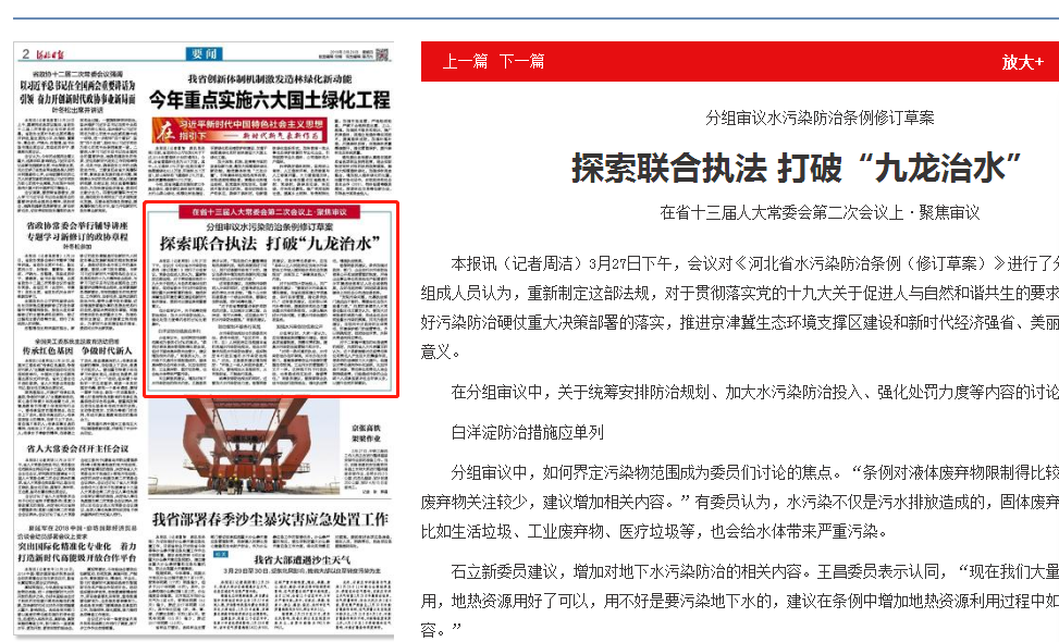 本报讯(记者周洁)3月27日下午,会议对《河北省水污染防治条例(修订草案)》进行了分组审议。常委会组成人员认为,重新制定这部法规,对于贯彻落实党的十九大关于促进人与自然和谐共生的要求,促进省委关于打好污染防治硬仗重大决策部署的落实,推进京津冀生态环境支撑区建设和新时代经济强省、美丽河北建设具有重要意义。