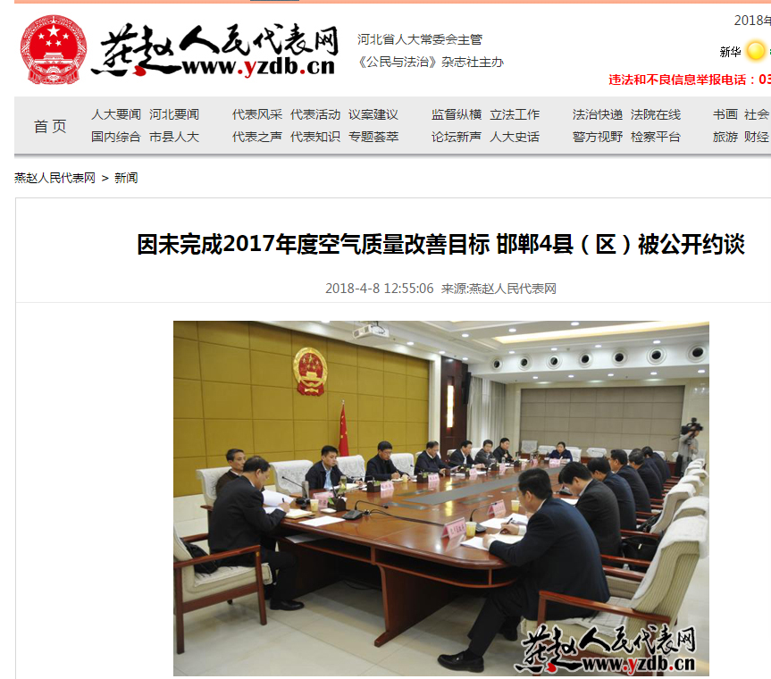 燕赵人民代表网:因未完成2017年度空气质量改善目标 邯郸4县(区)被公开约谈