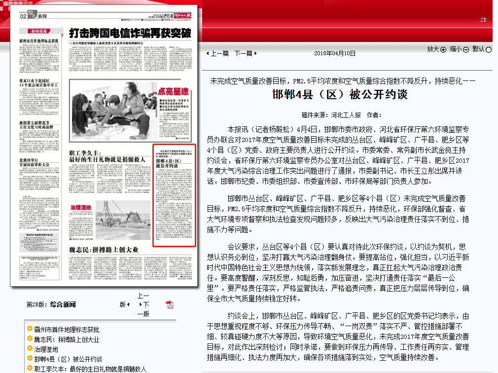 本报讯(记者杨毅松)4月4日,邯郸市委市政府、河北省环保厅第六环境监察专员办联合对2017年度空气质量改善目标未完成的丛台区、峰峰矿区、广平县、肥乡区等4个县(区)党委、政府主要负责人进行公开约谈。市委常委、常务副市长武金良主持约谈会,省环保厅第六环境监察专员办公室对丛台区、峰峰矿区、广平县、肥乡区2017年度大气污染综合治理工作突出问题进行了通报,市委副书记、市长王立彤出席并讲话。邯郸市纪委、市委组织部、市委宣传部、市环保局等部门负责人参加。