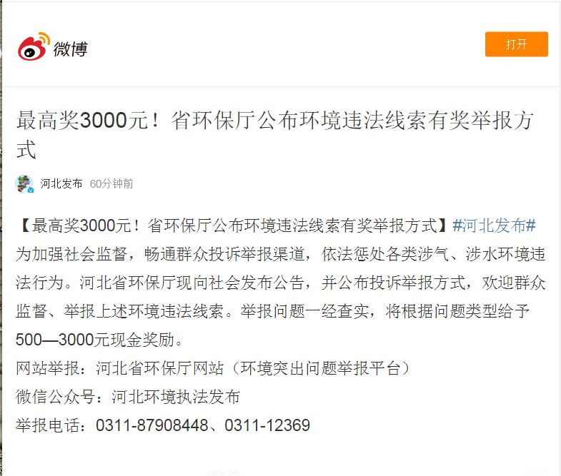 河北发布:最高奖3000元!省环保厅公布环境违法线索有奖举报方式