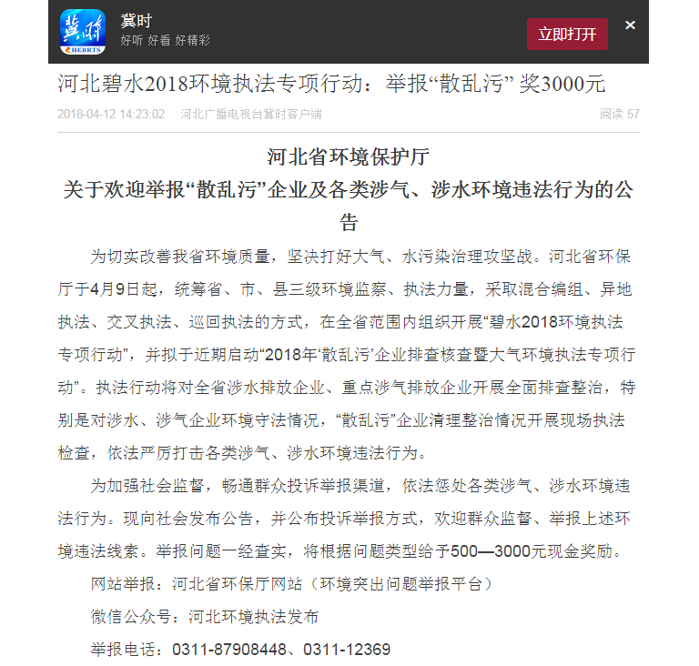 河北广播电视台冀时客户端:河北碧水2018环境执法专项行动:举报“散乱污” 奖3000元