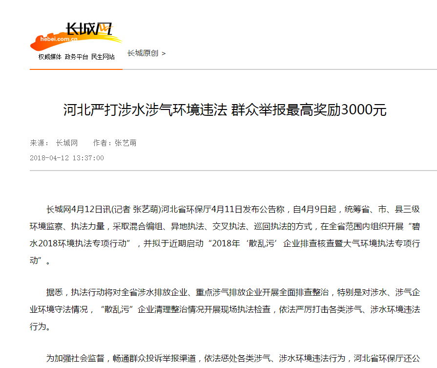 长城网:河北严打涉水涉气环境违法 群众举报最高奖励3000元