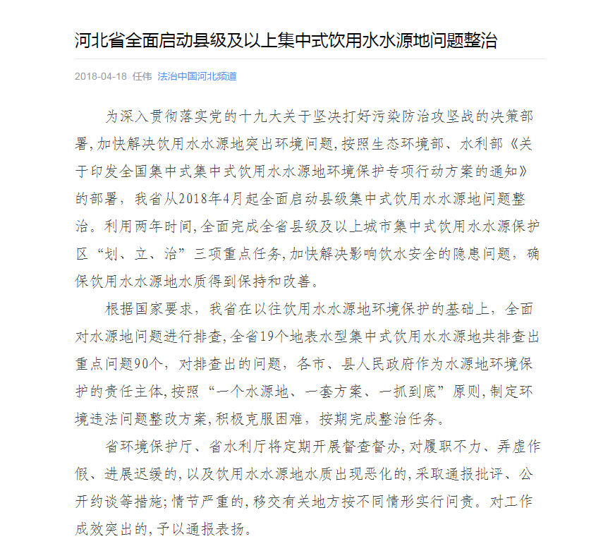 法治中国:河北省全面启动县级及以上集中式饮用水水源地问题整治