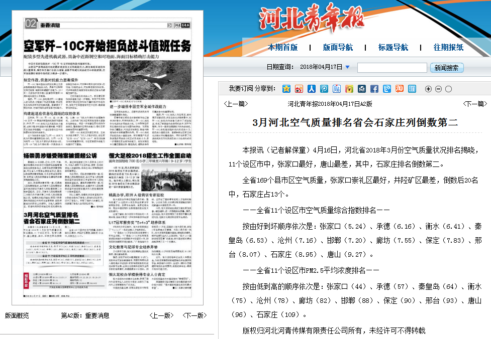 河北青年报:3月河北空气质量排名省会石家庄列倒数第二