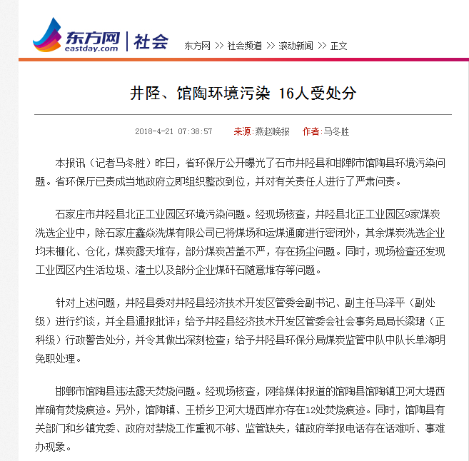 燕赵晚报:井陉、馆陶环境污染 16人受处分
