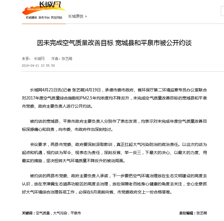 长城网:因未完成空气质量改善目标 宽城县和平泉市被公开约谈
