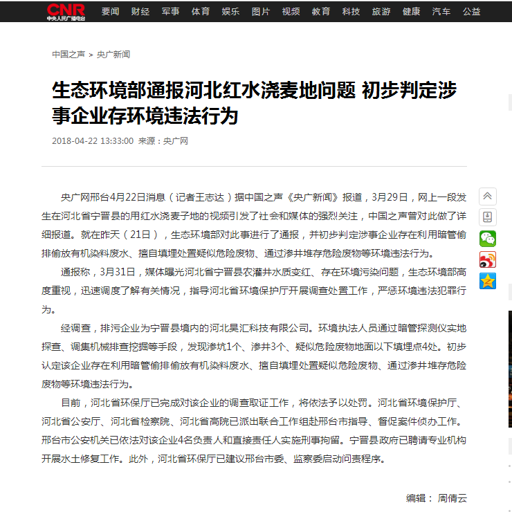 中国之声《央广新闻》:生态环境部通报河北红水浇麦地问题 初步判定涉事企业存环境违法行为