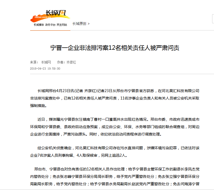 长城网:宁晋一企业非法排污案12名相关责任人被严肃问责
