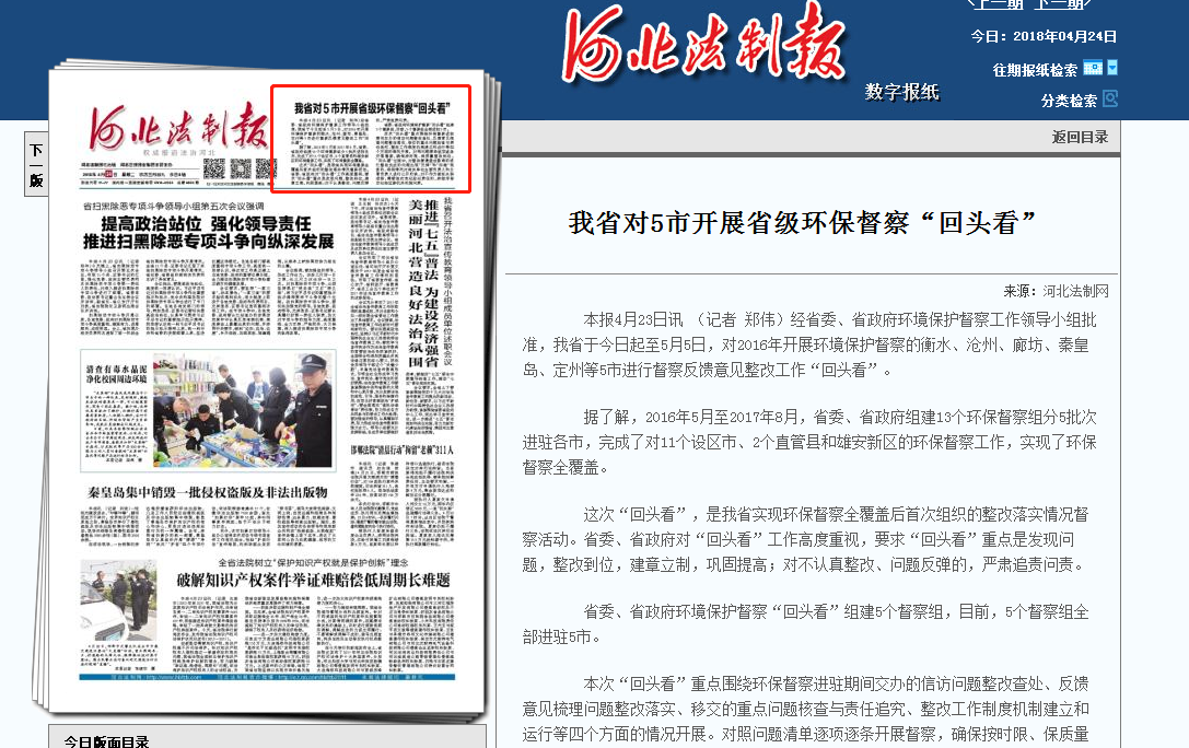 河北法制报:我省对5市开展省级环保督察“回头看”