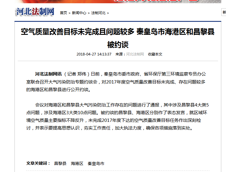河北法制网:空气质量改善目标未完成且问题较多 秦皇岛市海港区和昌黎县被约谈
