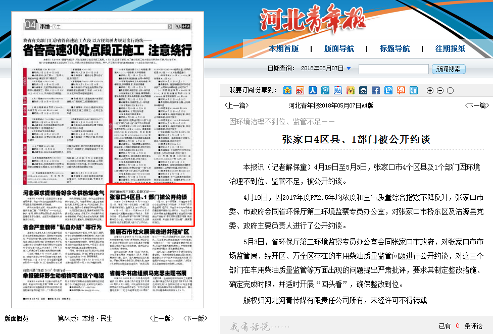 河北青年报:因环境治理不到位、监管不足——--张家口4区县、1部门被公开约谈
