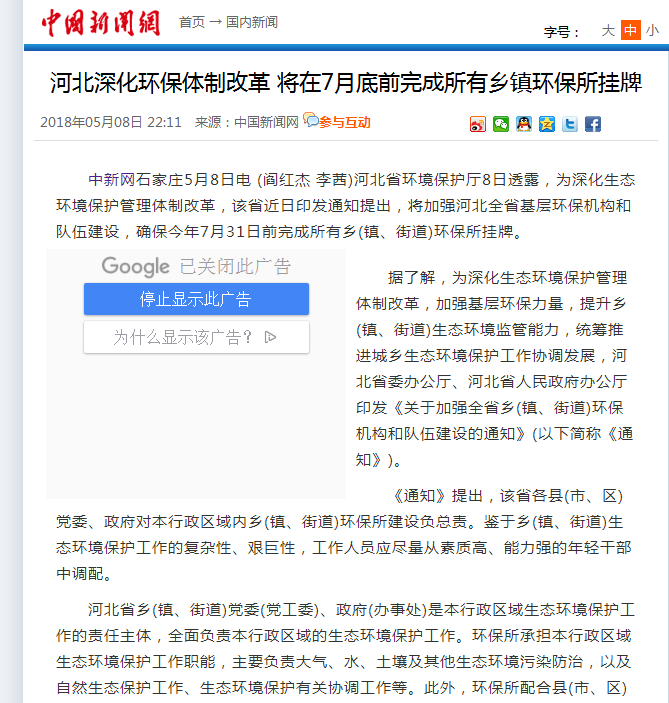 中国新闻网:河北深化环保体制改革 将在7月底前完成所有乡镇环保所挂牌