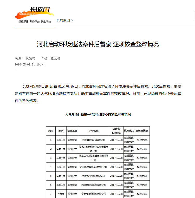 长城网:河北启动环境违法案件后督察 逐项核查整改情况