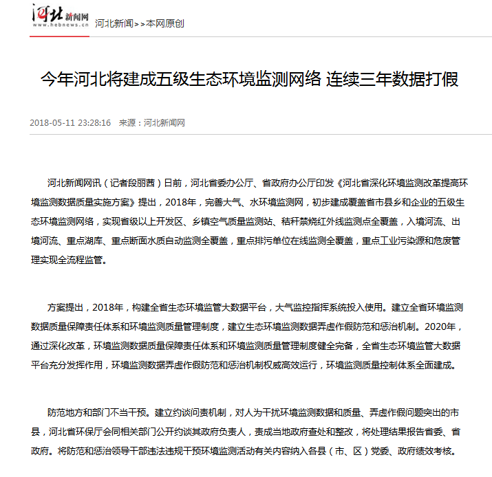 方案提出,自2018年起,河北省对环境质量监测、机动车尾气监测、社会化服务监测、排污单位自行监测等,连续3年开展打击环境监测数据弄虚作假行为专项行动。