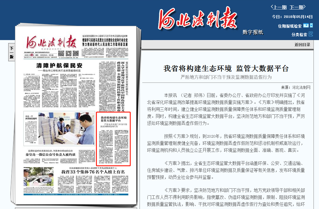 河北法制报:我省将构建生态环境 监管大数据平台