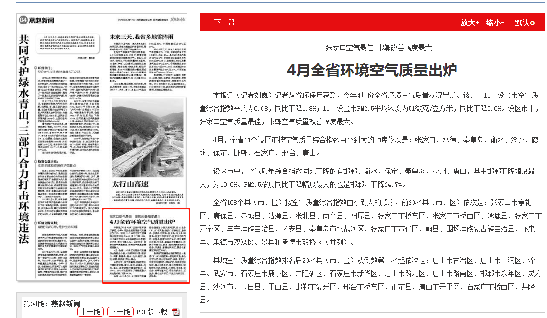 4月,全省11个设区市按空气质量综合指数由小到大的顺序依次是:张家口、承德、秦皇岛、衡水、沧州、廊坊、保定、邯郸、石家庄、邢台、唐山。