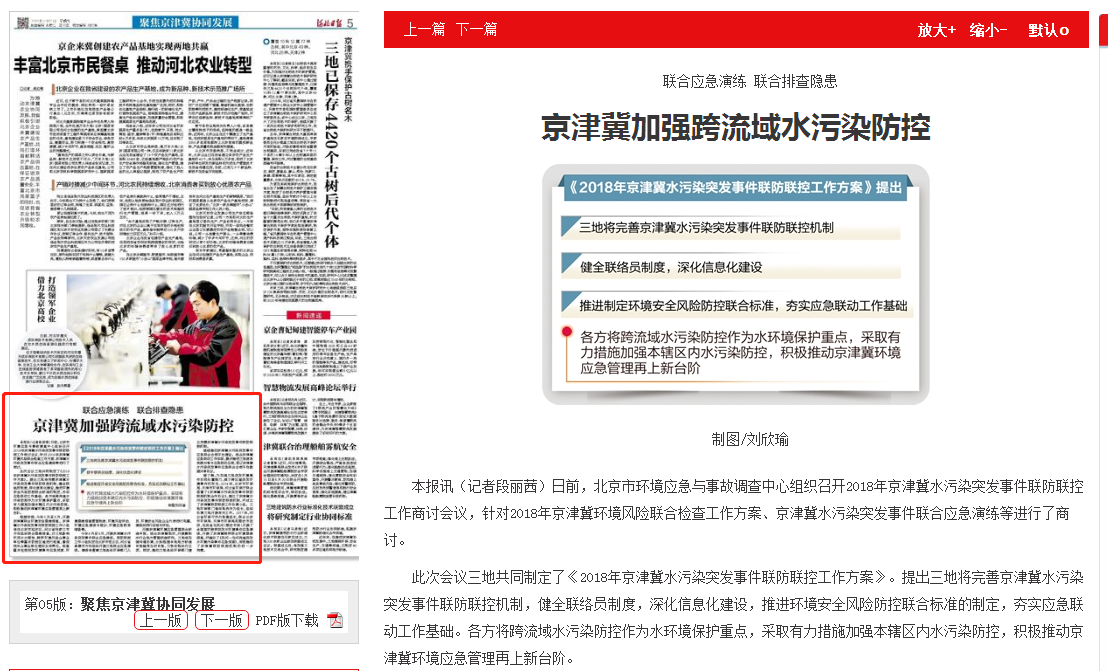 据了解,为加强三地突发环境事件协同处置能力,减少跨区域突发环境事件的发生,2014年,北京市环保局、天津市环保局、河北省环保厅联合签署了《京津冀水污染突发事件联防联控机制合作协议》,建立了京津冀水污染突发事件联防联控机制,并成立了京津冀联防联控工作协调小组。三地环保部门每年轮流作为组长,组织协调三地开展有关工作。2017年,河北省环保厅作为轮值组长,联合北京市环保局、天津市环保局和廊坊市政府,在我省龙凤河(廊坊市段)开展了全国首次跨界突发水环境事件应急演练,开展了京津冀跨界联合环境隐患排查,并编印了《凤河—龙河流域突发水环境污染事件应急预案》,有效推动了京津冀联防联控机制的进一步完善。
