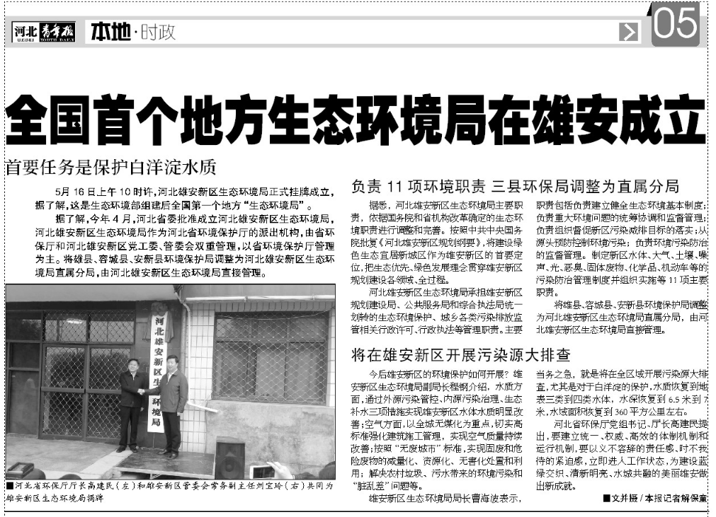 河北青年报:全国首个地方生态环境局在雄安成立(0517)