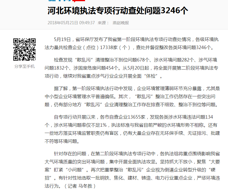 据了解,第一阶段环境执法行动中发现,企业环境管理薄弱环节充分暴露,尤其是中小型企业环境管理水平普遍偏低。其次,“散乱污”整治工作仍然存在一些突出问题,仍有部分地方“散乱污”企业清理整治工作存在排查不细致、整治不到位等问题。