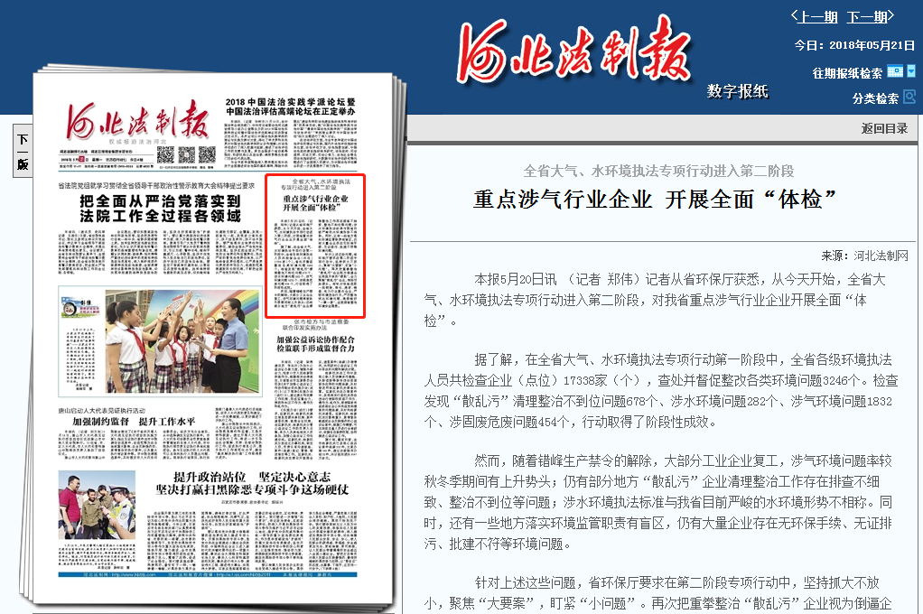 河北法制报:全省大气、水环境执法专项行动进入第二阶段 重点涉气行业企业 开展全面“体检”