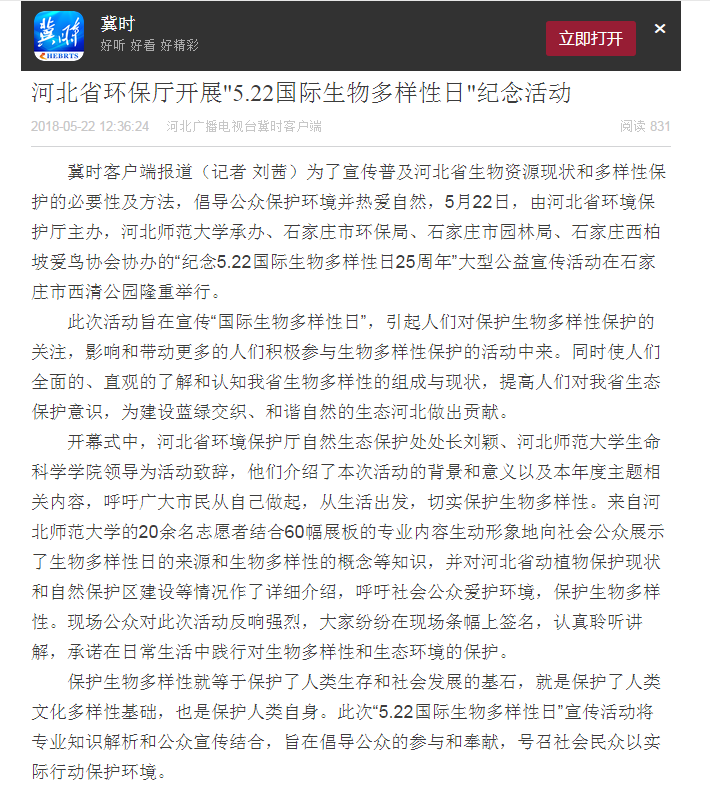 此次活动旨在宣传“国际生物多样性日”,引起人们对保护生物多样性保护的关注,影响和带动更多的人积极参与生物多样性保护的活动中来。同时使人们全面的、直观的了解和认知我省生物多样性的组成与现状,提高人们对我省生态保护意识,为建设蓝绿交织、和谐自然的生态河北作出贡献。
