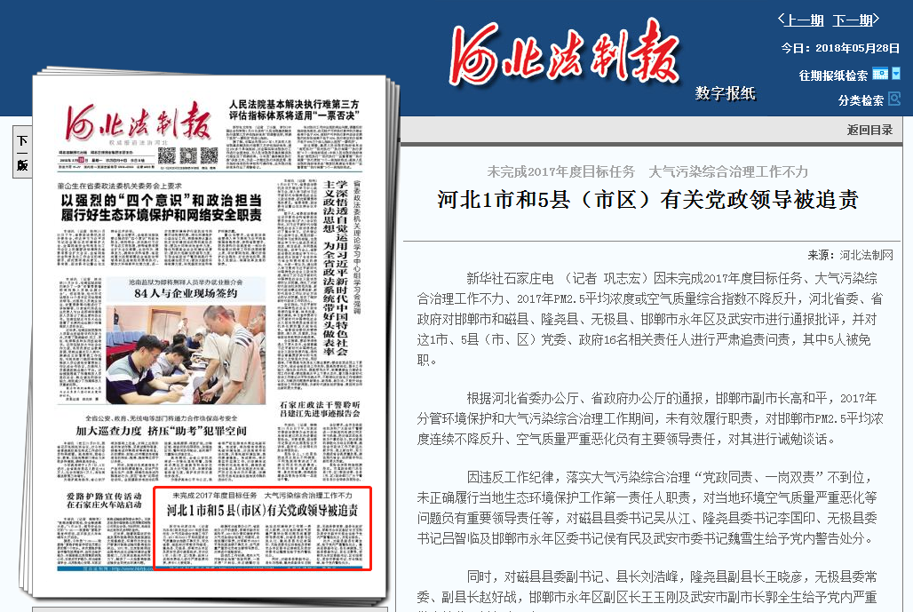 因未完成2017年度目标任务、大气污染综合治理工作不力、2017年PM2.5平均浓度或空气质量综合指数不降反升,河北省委、省政府对邯郸市和磁县、隆尧县、无极县、邯郸市永年区及武安市进行通报批评,并对这1市、5县(市、区)党委、政府16名相关责任人进行严肃追责问责,其中5人被免职。