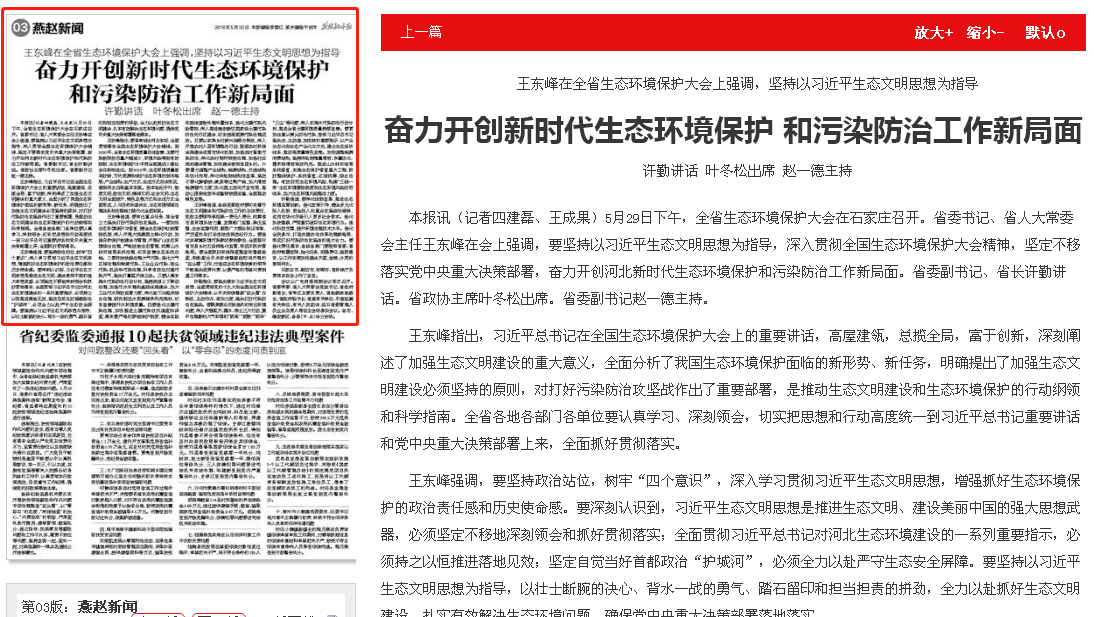 王东峰强调,要突出重点任务,举全省之力坚决打好污染防治攻坚战。一要加快生态环境保护与修复,健全生态保护红线管控机制,深入开展大规模国土绿化行动,加强自然保护地建设与管理,开展矿山生态环境综合治理,严格坡地生态管理,统筹山水林田湖草系统治理,切实改善生态系统功能。二要依法铁腕治理大气污染,强化大气区域治理和燃煤污染、工业企业污染、扬尘污染、机动车污染治理,科学有效应对重污染天气,坚决打赢蓝天保卫战。三要认真实施水污染防治行动计划,坚持流域上下联动治理,加强污水处理和基础设施建设,加大工业污水排放监管力度,深化地下水超采综合治理,研究制定水资源涵养利用规划,切实改善提升水环境质量。四要强化土壤污染治理,加快推进土壤污染状况调查和详查,落实最严格的耕地保护制度,健全垃圾和固体废物处理处置体系,强化土壤污染风险管控,深入推进雄安新区国家级土壤污染防治先行区建设,切实提高面源污染治理成效。五要以实施乡村振兴战略为契机,深入开展农村人居环境整治行动,探索农村环保设施建设运营市场化机制,加强农村畜禽污染防治,深化农村秸秆焚烧治理,加强村庄规划建设管理,加快建设美丽宜居乡村。六要着力调整产业结构、能源结构、交通结构和优化布局,深化供给侧结构性改革,坚定不移化解钢铁、煤炭等过剩产能,加大清洁能源替代力度,优化国土空间开发布局,推动公路柴油货车运输转铁路运输,全面推动绿色发展。