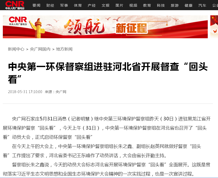 央广网石家庄5月31日消息(记者明慧)继中央第三环境保护督察组昨天(30日)进驻黑龙江省开展环境保护督察“回头看”,今天上午(31日),中央第一环境保护督察组在河北省也召开了“回头看”动员大会,正式启动环保督察“回头看”