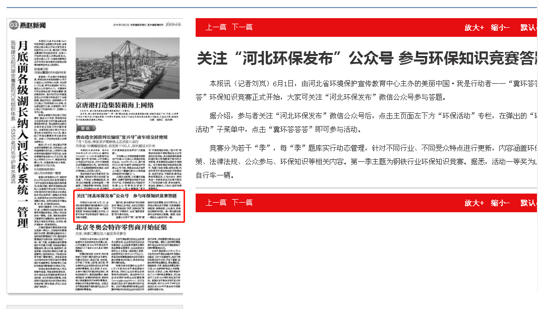 本报讯(记者刘岚)6月1日,由河北省环境保护宣传教育中心主办的美丽中国·我是行动者——“冀环答答答”环保知识竞赛正式开始,大家可关注“河北环保发布”微信公众号参与答题。