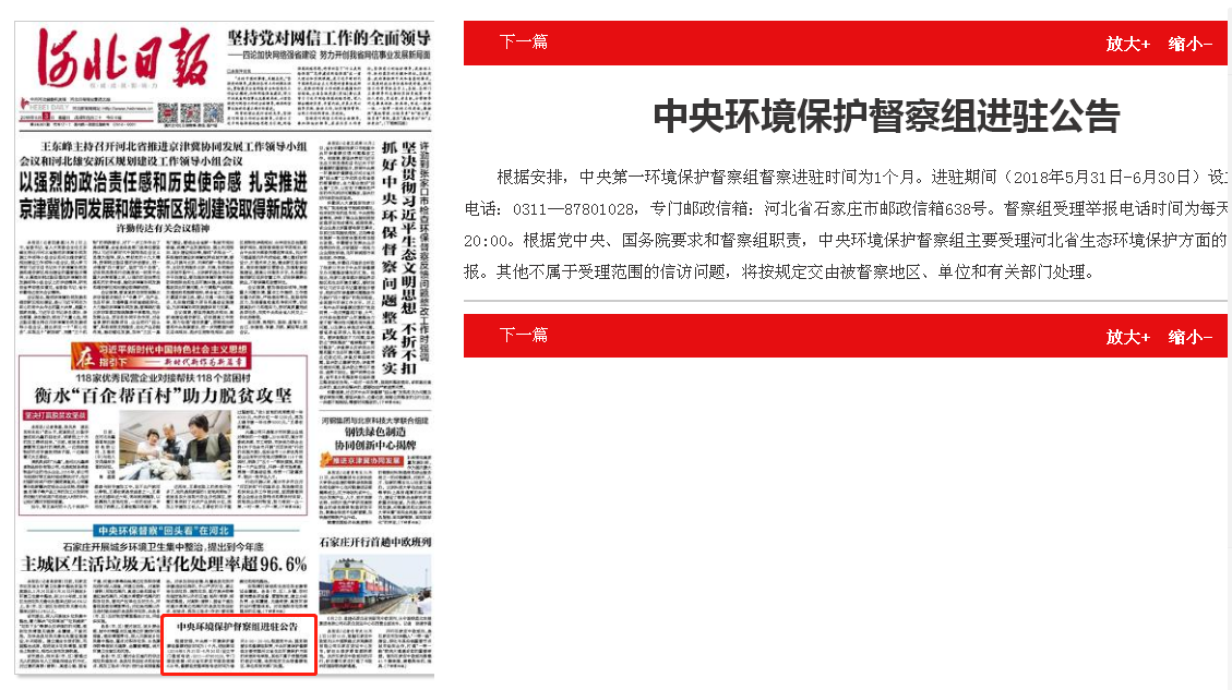 【河北日报头版】: 中央环境保护督察组进驻公告