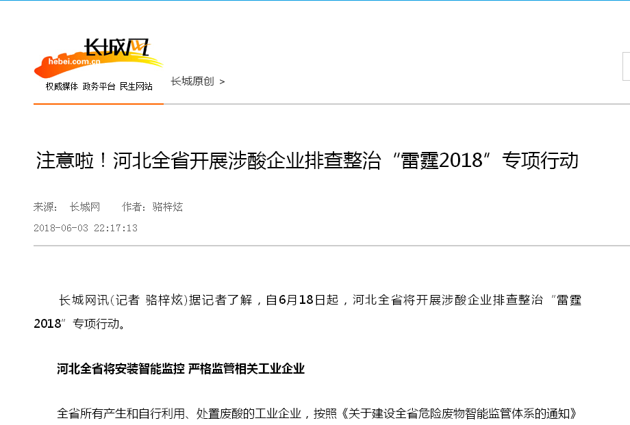长城网:注意啦!河北全省开展涉酸企业排查整治“雷霆2018”专项行动