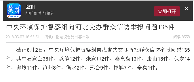 河北广播电视台冀时客户端:中央环境保护督察组向河北交办群众信访举报问题135件