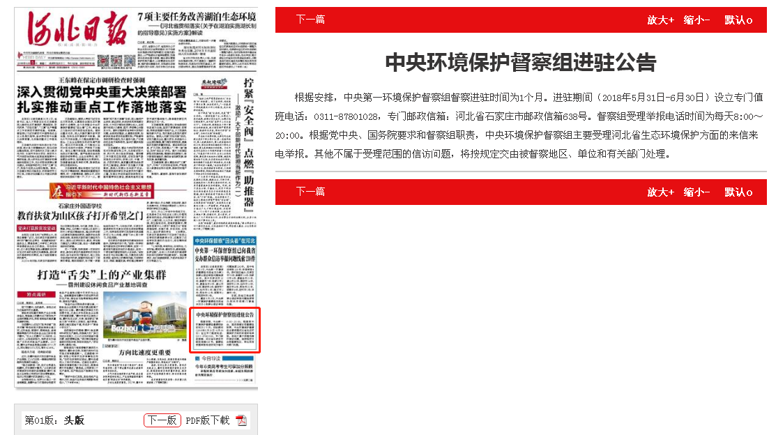 河北日报头版:中央环境保护督察组进驻公告