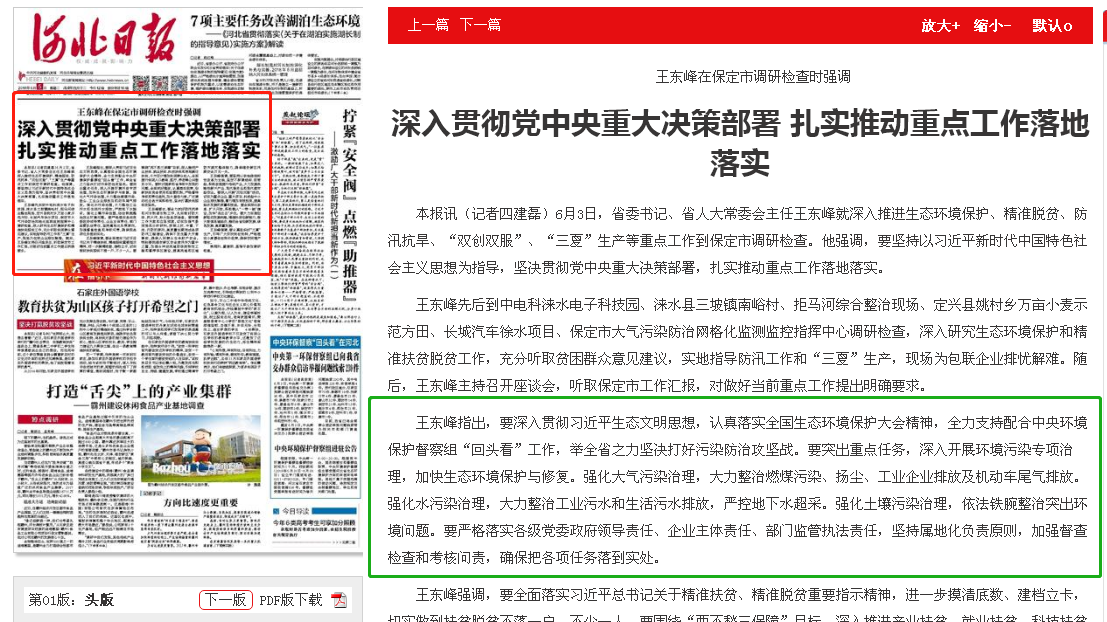 王东峰先后到中电科涞水电子科技园、涞水县三坡镇南峪村、拒马河综合整治现场、定兴县姚村乡万亩小麦示范方田、长城汽车徐水项目、保定市大气污染防治网格化监测监控指挥中心调研检查,深入研究生态环境保护和精准扶贫脱贫工作,充分听取贫困群众意见建议,实地指导防汛工作和“三夏”生产,现场为包联企业排忧解难。随后,王东峰主持召开座谈会,听取保定市工作汇报,对做好当前重点工作提出明确要求。