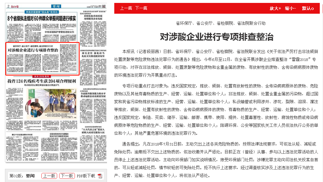 本报讯(记者段丽茜)日前,省环保厅、省公安厅、省检察院、省法院联合发出《关于依法严厉打击非法倾倒处置废酸等危险废物违法犯罪行为的通告》提出,今年6月至12月,在全省开展涉酸企业排查整治“雷霆2018”专项行动,对存在非法排放、倾倒、处置废酸等危险废物和含重金属的废物、有放射性的废物、含传染病病原体废物的环境违法犯罪行为开展重点打击。