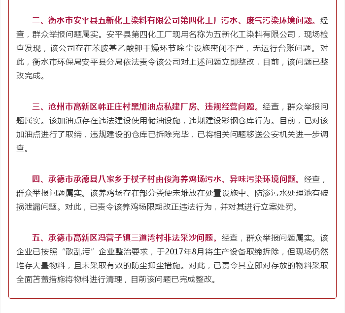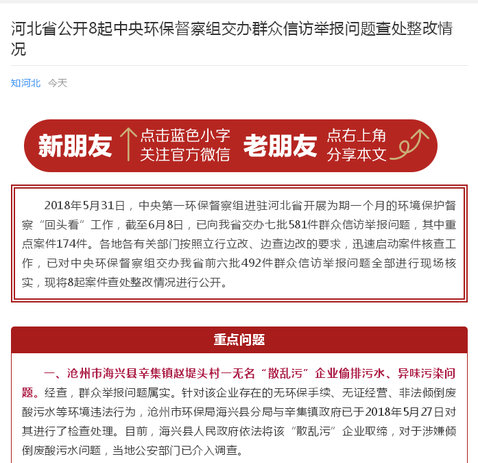 河北省公开8起中央环保督察组交办群众信访举报问题查处整改情况