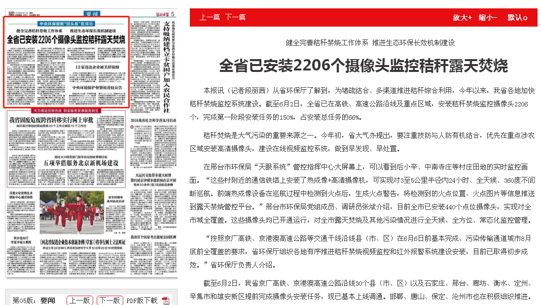 “按照京广高铁、京港澳高速公路等交通干线沿线县(市、区)在6月6日前基本完成、污染传输通道城市8月底前全覆盖的要求,省环保厅组织各地有序推进秸秆禁烧视频监控和红外报警系统建设安装,目前已取得初步成效。”省环保厅负责人介绍。