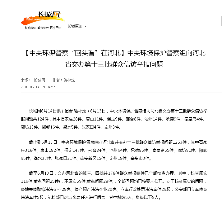 长城网:【中央环保督察“回头看”在河北】中央环境保护督察组向河北省交办第十三批群众信访举报问题
