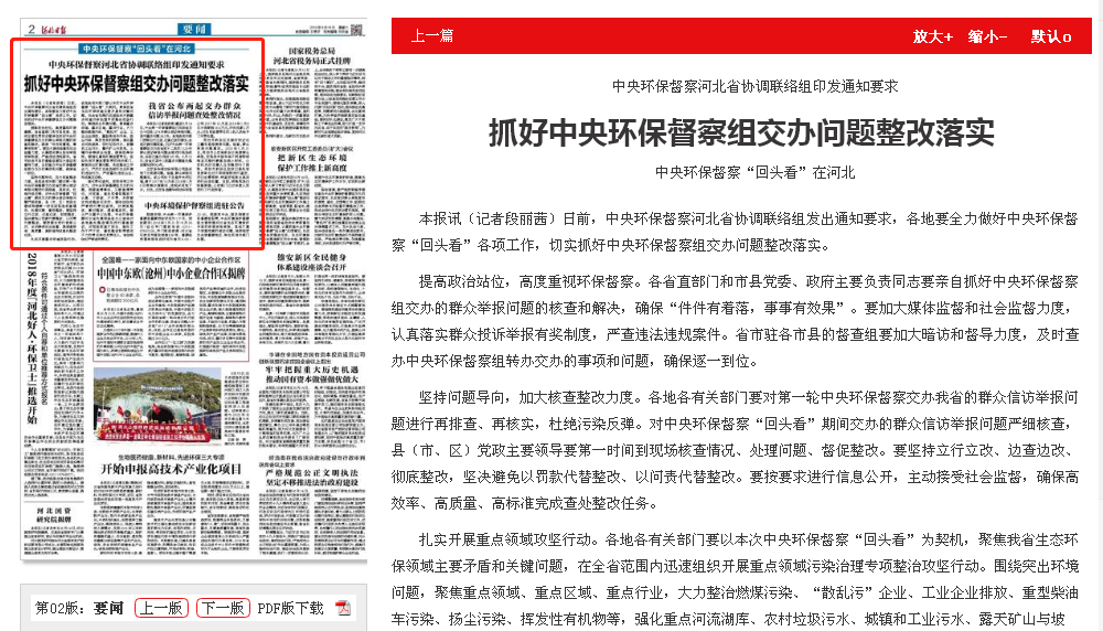 本报讯(记者段丽茜)日前,中央环保督察河北省协调联络组发出通知要求,各地要全力做好中央环保督察“回头看”各项工作,切实抓好中央环保督察组交办问题整改落实。