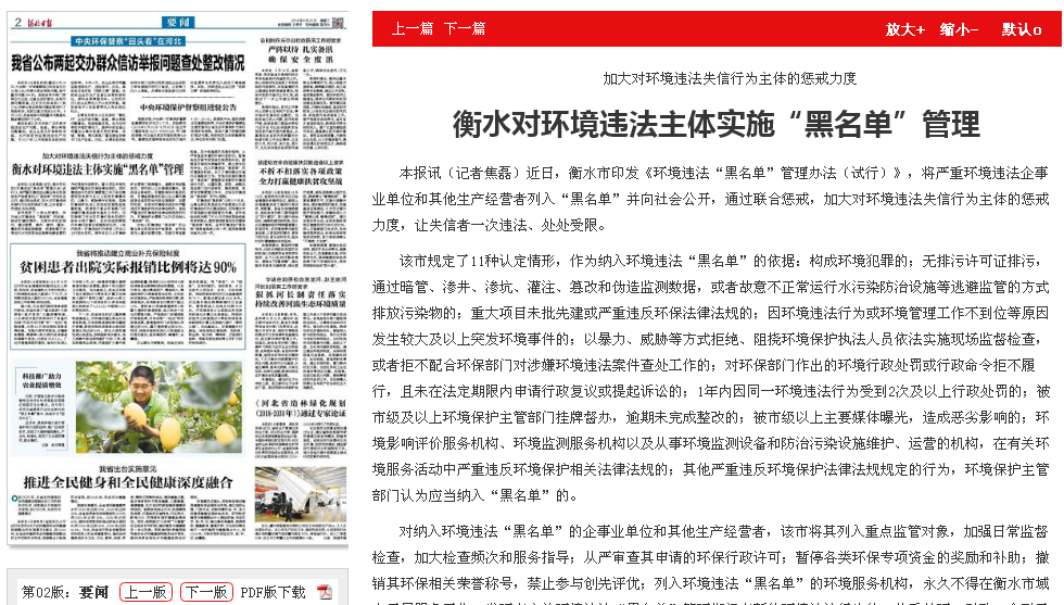 河北日报:加大对环境违法失信行为主体的惩戒力度 衡水对环境违法主体实施“黑名单”管理
