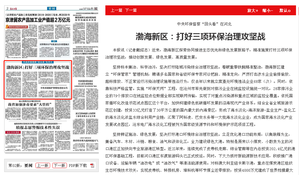 河北日报:中央环保督察“回头看”在河北 渤海新区:打好三项环保治理攻坚战