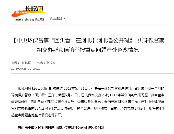 长城网:【中央环保督察“回头看”在河北】河北省公开3起中央环保督察组交办群众信访举报重点问题查处整改情况