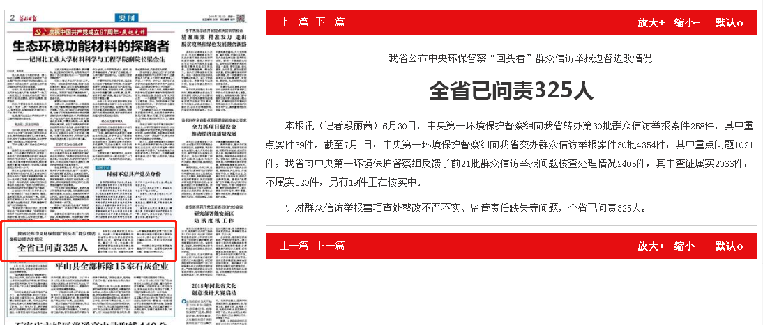 河北日报:我省公布中央环保督察“回头看”群众信访举报边督边改情况 全省已问责325人