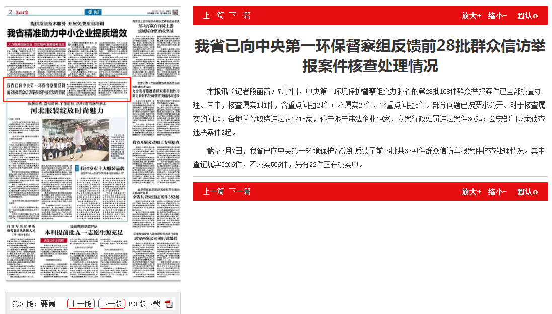 河北日报:我省已向中央第一环保督察组反馈前28批群众信访举报案件核查处理情况
