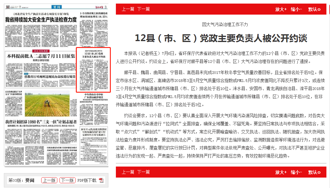 河北日报:因大气污染治理工作不力 12县(市、区)党政主要负责人被公开约谈