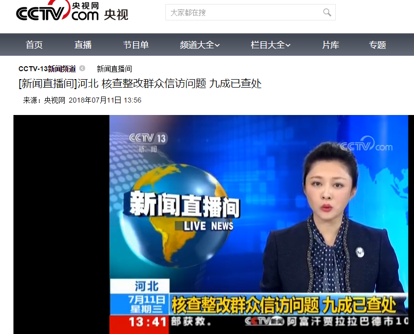 CCTV-13新闻频道 新闻直播间:河北 核查整改群众信访问题 九成已查处 来源:省生态环境宣传教育中心 时间:2018-07-12
