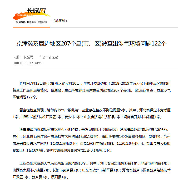 长城网:京津冀及周边地区207个县市、区被查出涉气环境问题122个